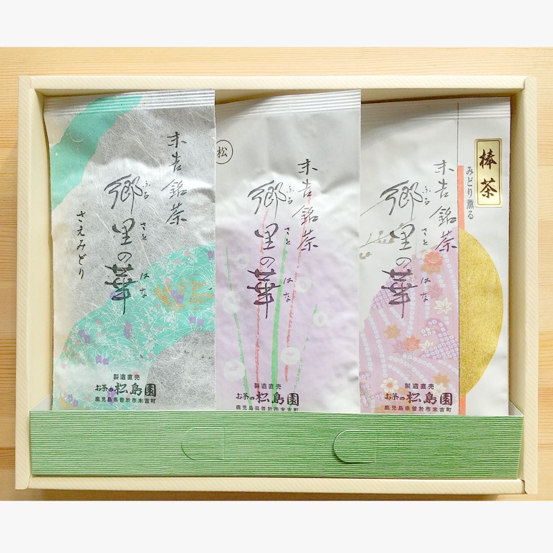 「に」セット:リーフ3本詰め合わせ(100g×3本)_さえみどり・松印・奥みどり<棒茶>×各1本セット (のし:蝶結び)